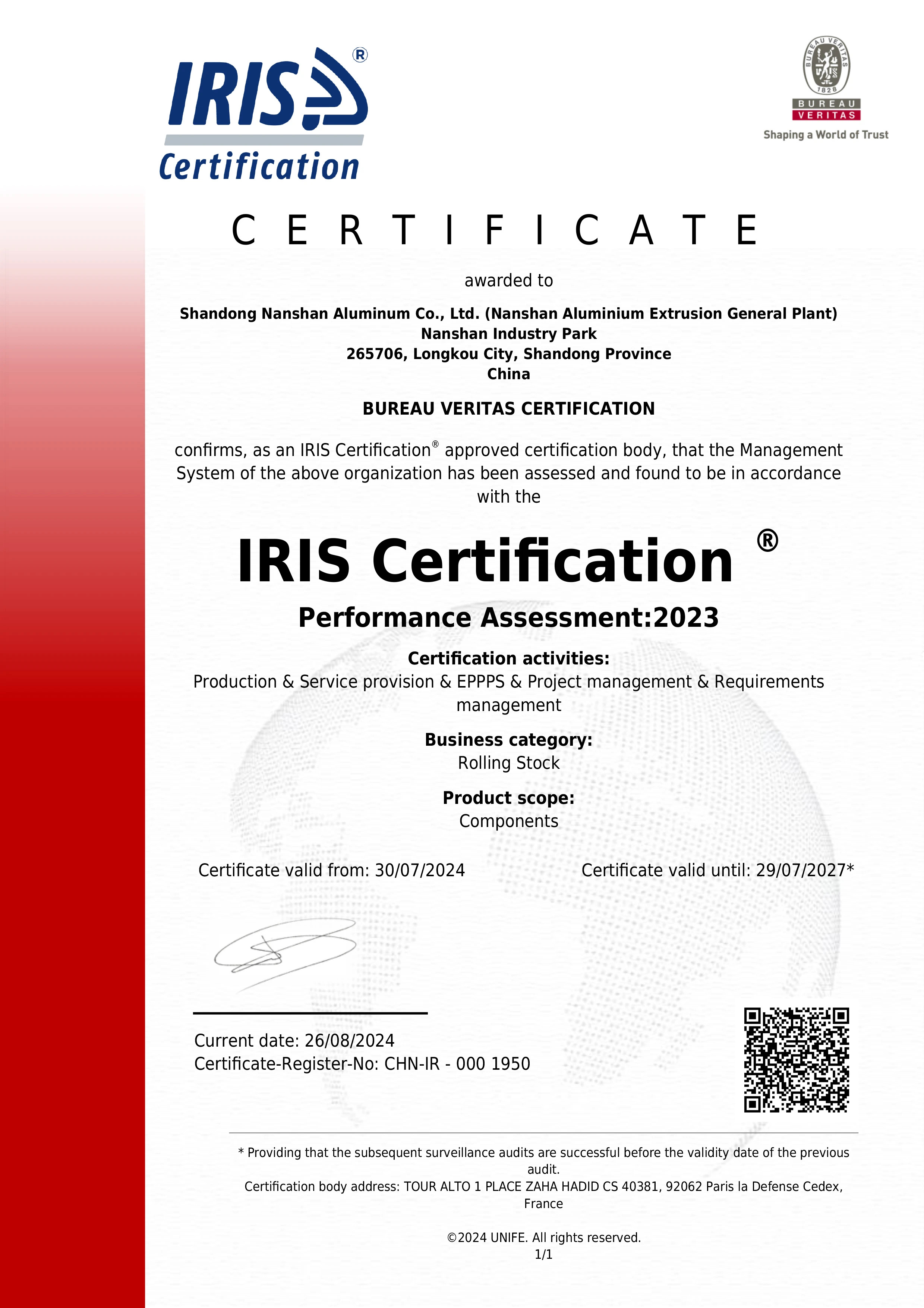 近日,南山鋁材公司順利通過BV認(rèn)證機(jī)構(gòu)審核專家對(duì)ISO22163:2023軌道交通質(zhì)量管理體系的年度監(jiān)督審核,審核結(jié)果由銅牌升級(jí)為銀牌,這標(biāo)志著南山鋁業(yè)在鐵路行業(yè)整體質(zhì)量管理、過程績(jī)效評(píng)價(jià)及顧客感知的卓越表現(xiàn)再獲國(guó)際權(quán)威認(rèn)可,進(jìn)一步提升了企業(yè)的核心競(jìng)爭(zhēng)力和品牌影響力。