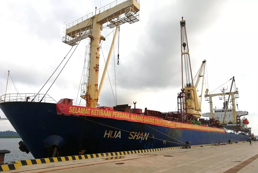 伴隨一聲汽笛,滿載氧化鋁、電廠等設備原件的“華山號”順利靠泊印尼賓坦氧化鋁有限公司碼頭。該貨輪長115米,寬20米,載重14000噸,是自碼頭開埠以來靠泊的首艘大型貨輪。