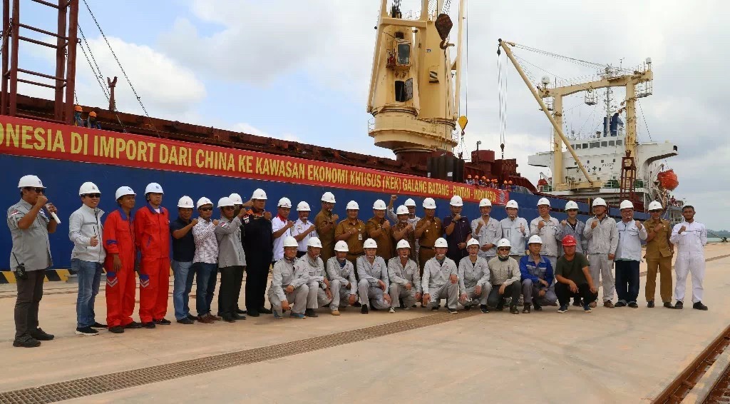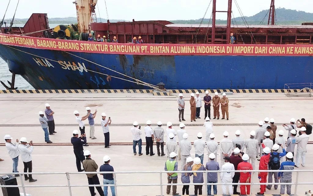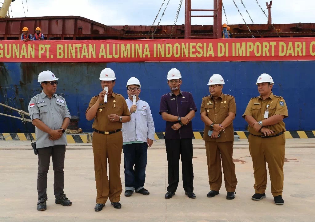 7月16日上午,印尼賓坦氧化鋁有限公司港口首次靠泊儀式在港口碼頭舉行,廖內群島省長伊思迪安多(Isdianto),廖內群島經濟發展局局長薩姆蘇(Syamsul Bahrum),民丹縣勞工局處長英德拉(Indra Hidayat),卡朗巴塘經濟特區行政長官海思凡(Hazfarizal),印尼項目總經理郝維松,董事張國燈,合作單位及港口相關負責人參加靠泊儀式。