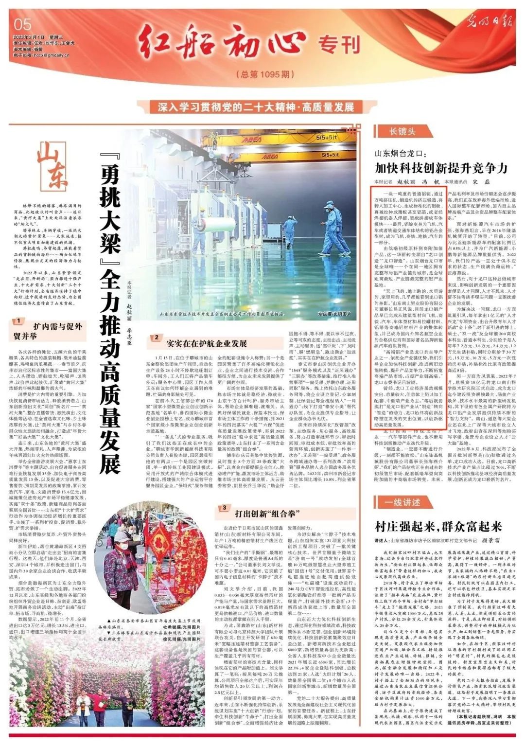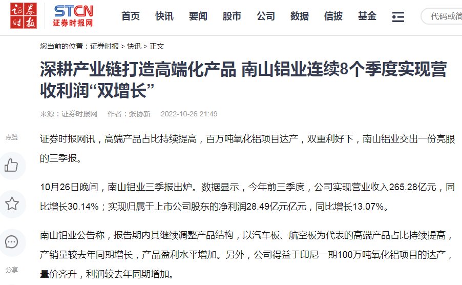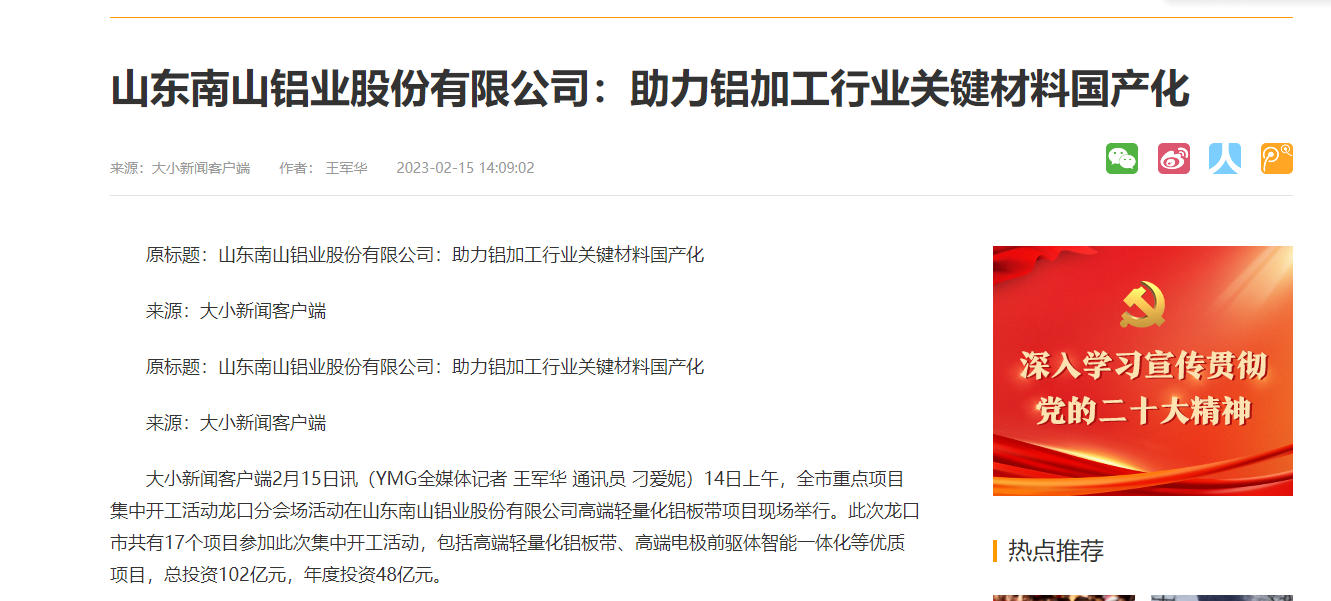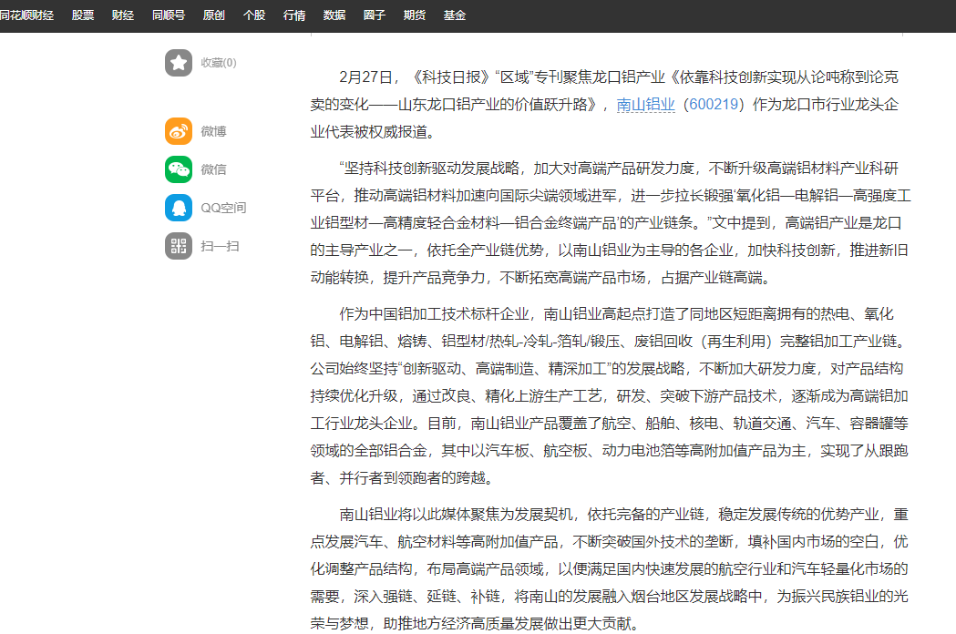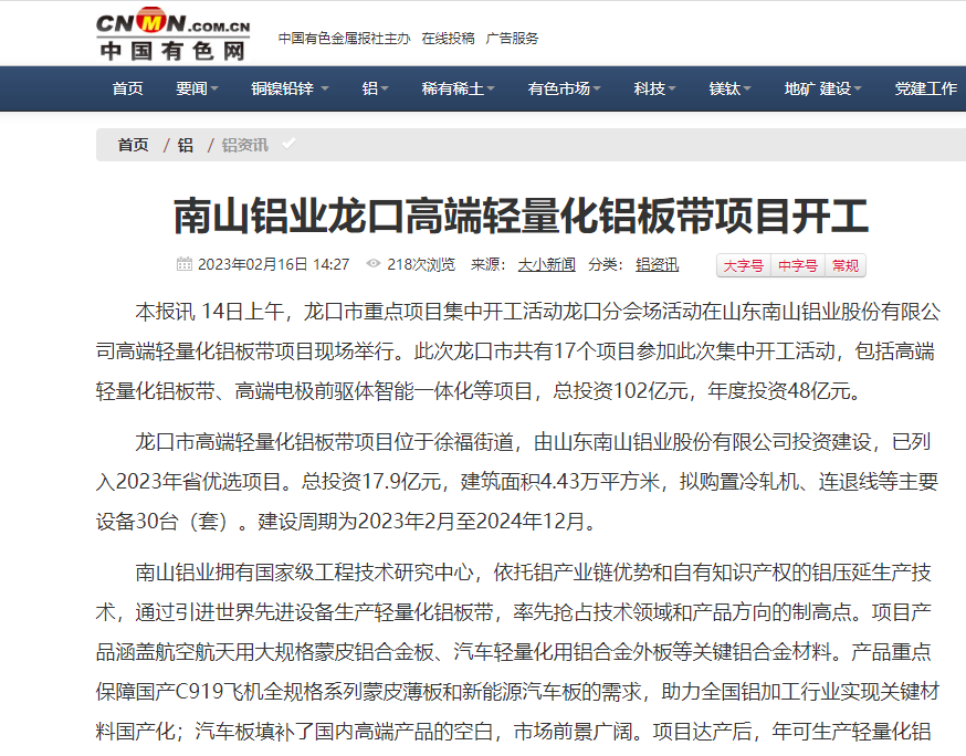 2月27日,《科技日報》“區域”專刊聚焦龍口鋁產業《依靠科技創新實現從論噸稱到論克賣的變化——山東龍口鋁產業的價值躍升路》,南山鋁業(600219)作為龍口市行業龍頭企業代表被權威報道。
